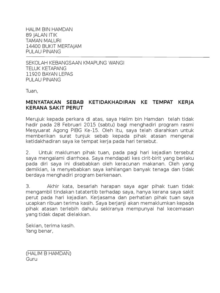 TuanPuan SURAT TUNJUK SEBAB KETIDAKHADIRAN KERJA. Jika anda dalam situasi yang.